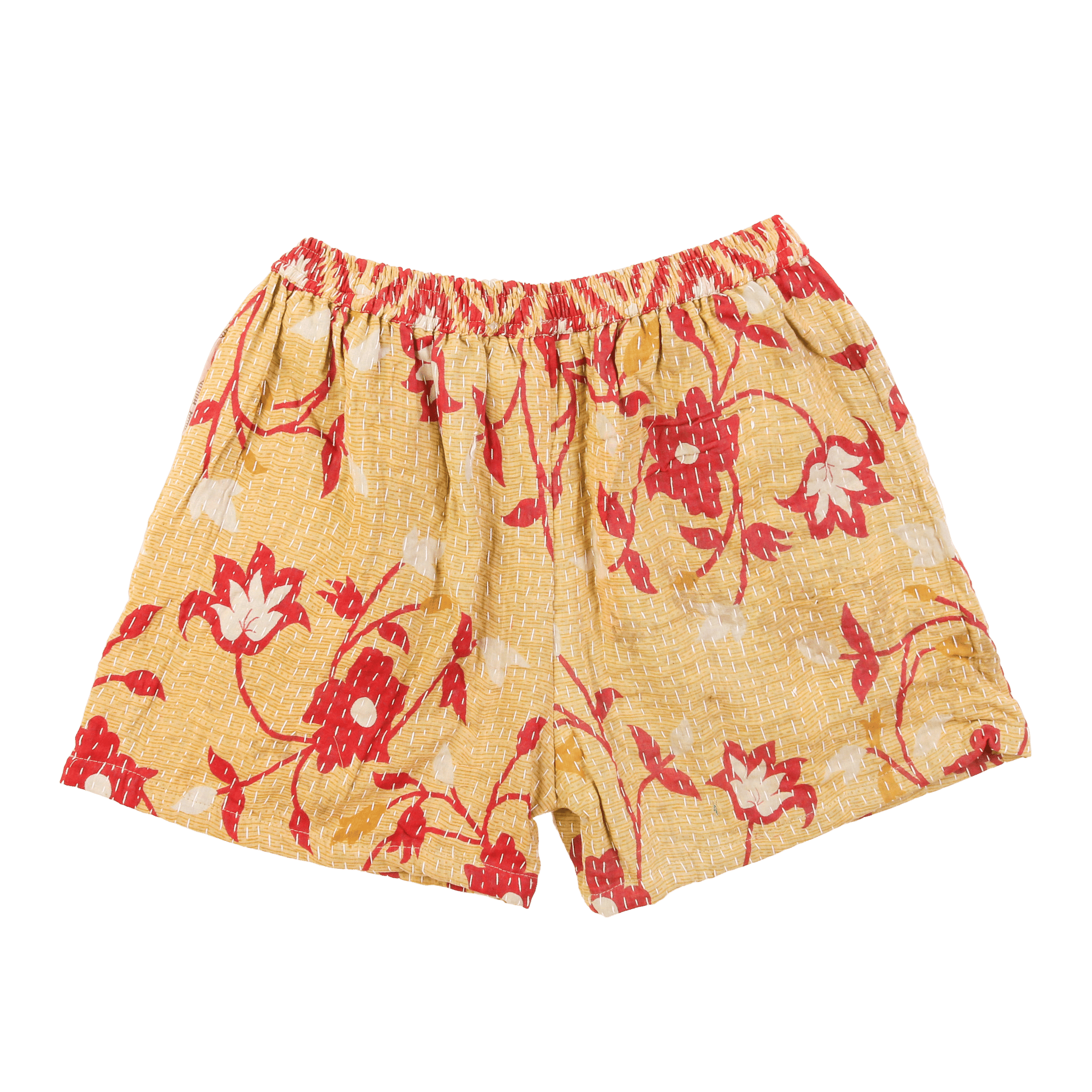 The main exterior of the shorts are made from 100% repurposed and recycled used materials. The material is antique Kantha Blankets sourced from India.