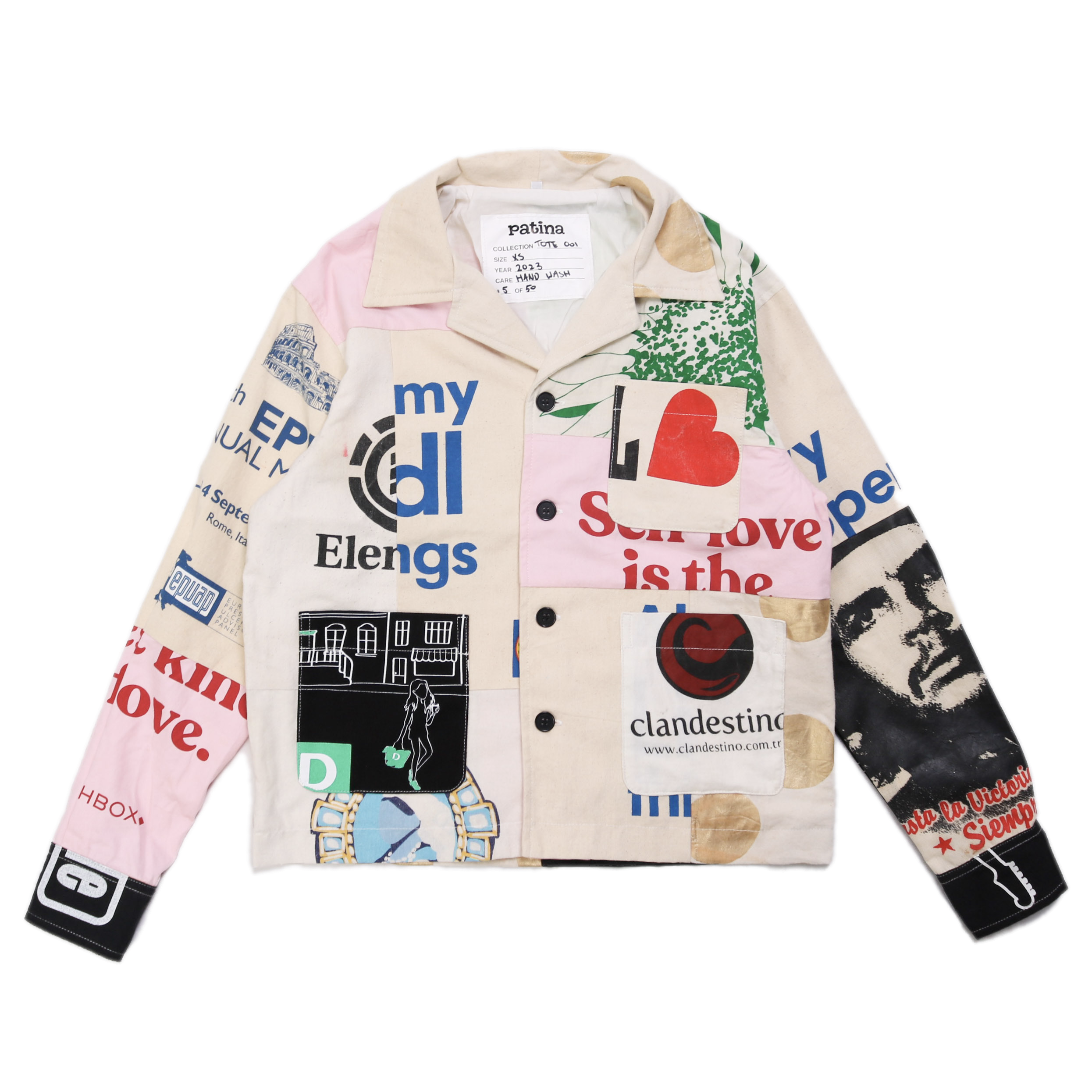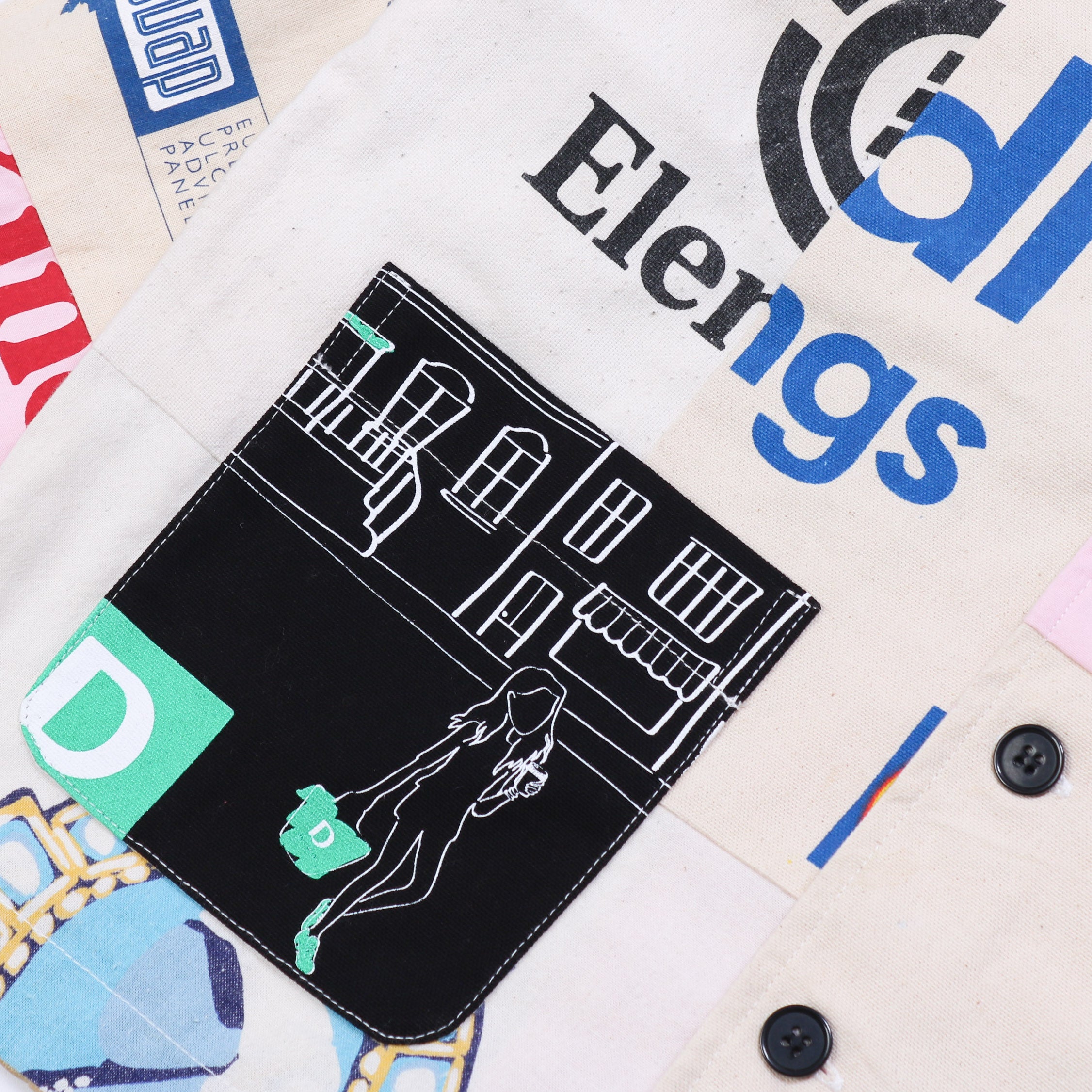 Each jacket is crafted from a combination of high-quality (but discarded) tote bags. These bags are thoroughly cleaned, sorted, and processed to create an entirely new product out of waste. Every piece is unique and tells a story of its past.