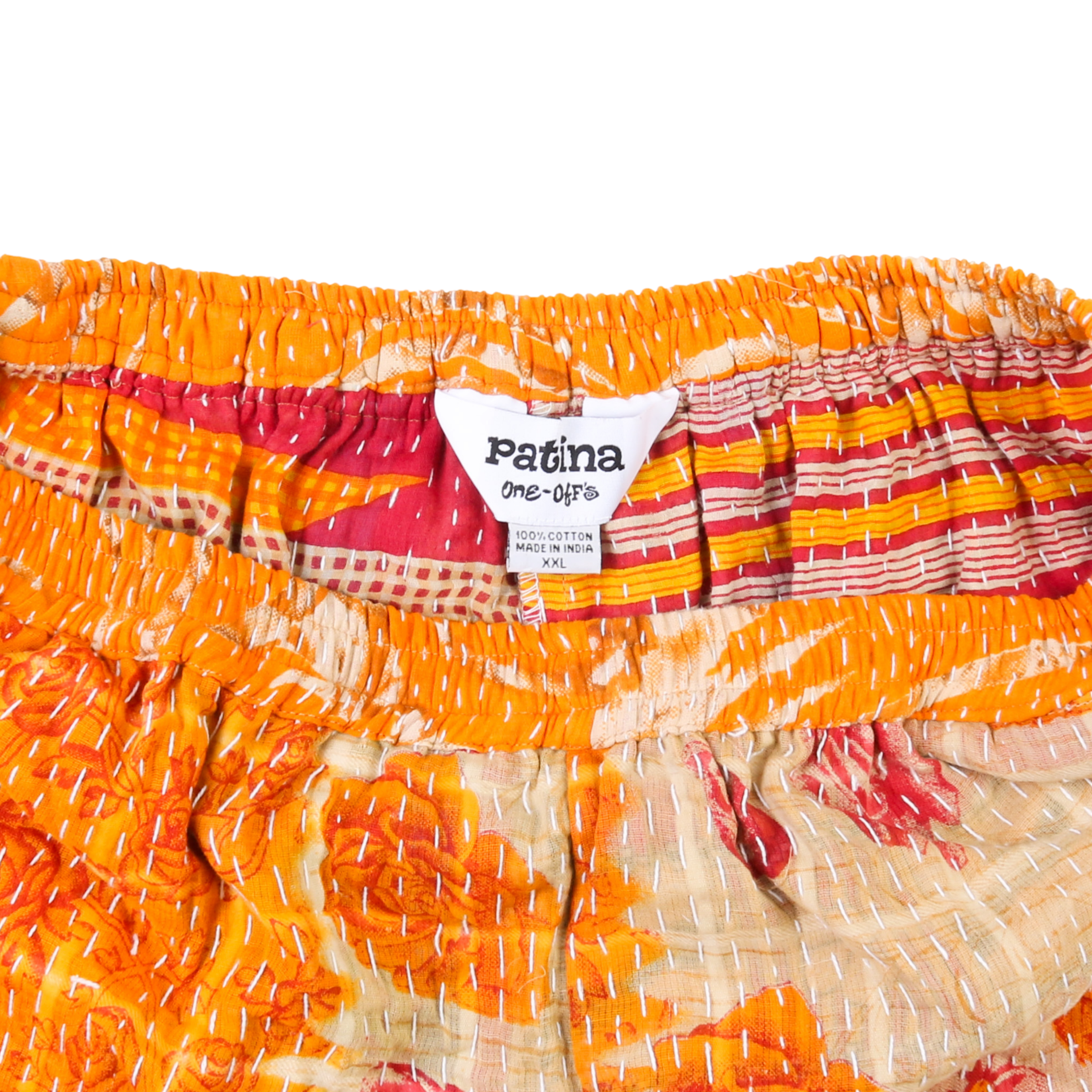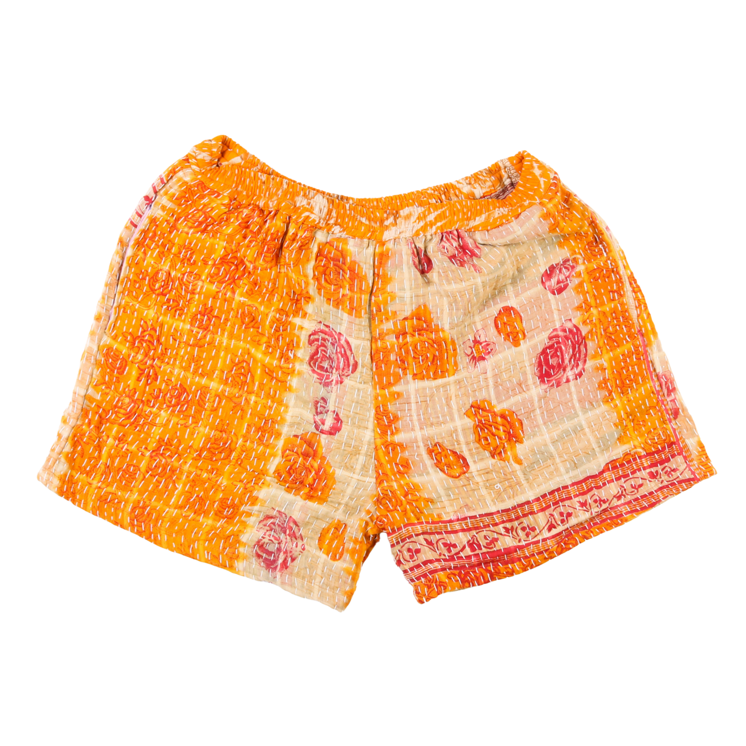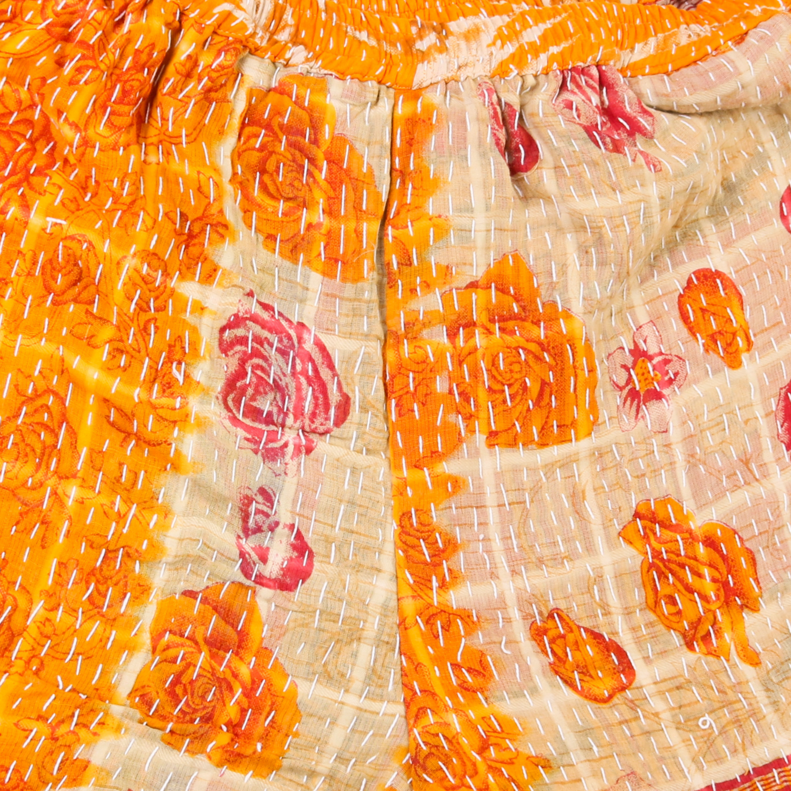 The main exterior of the shorts are made from 100% repurposed and recycled used materials. The material is antique Kantha Blankets sourced from India.