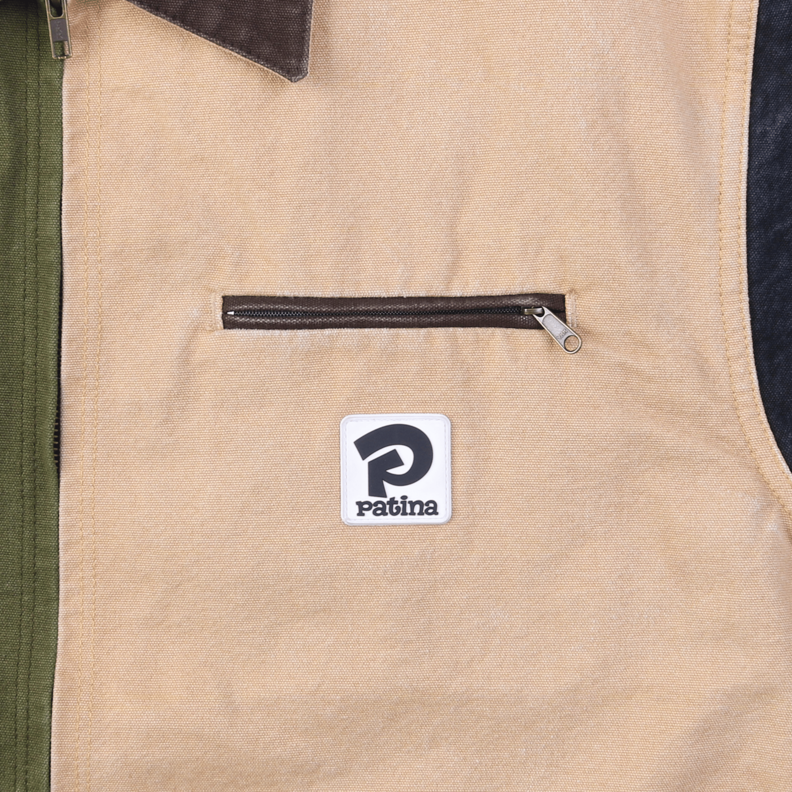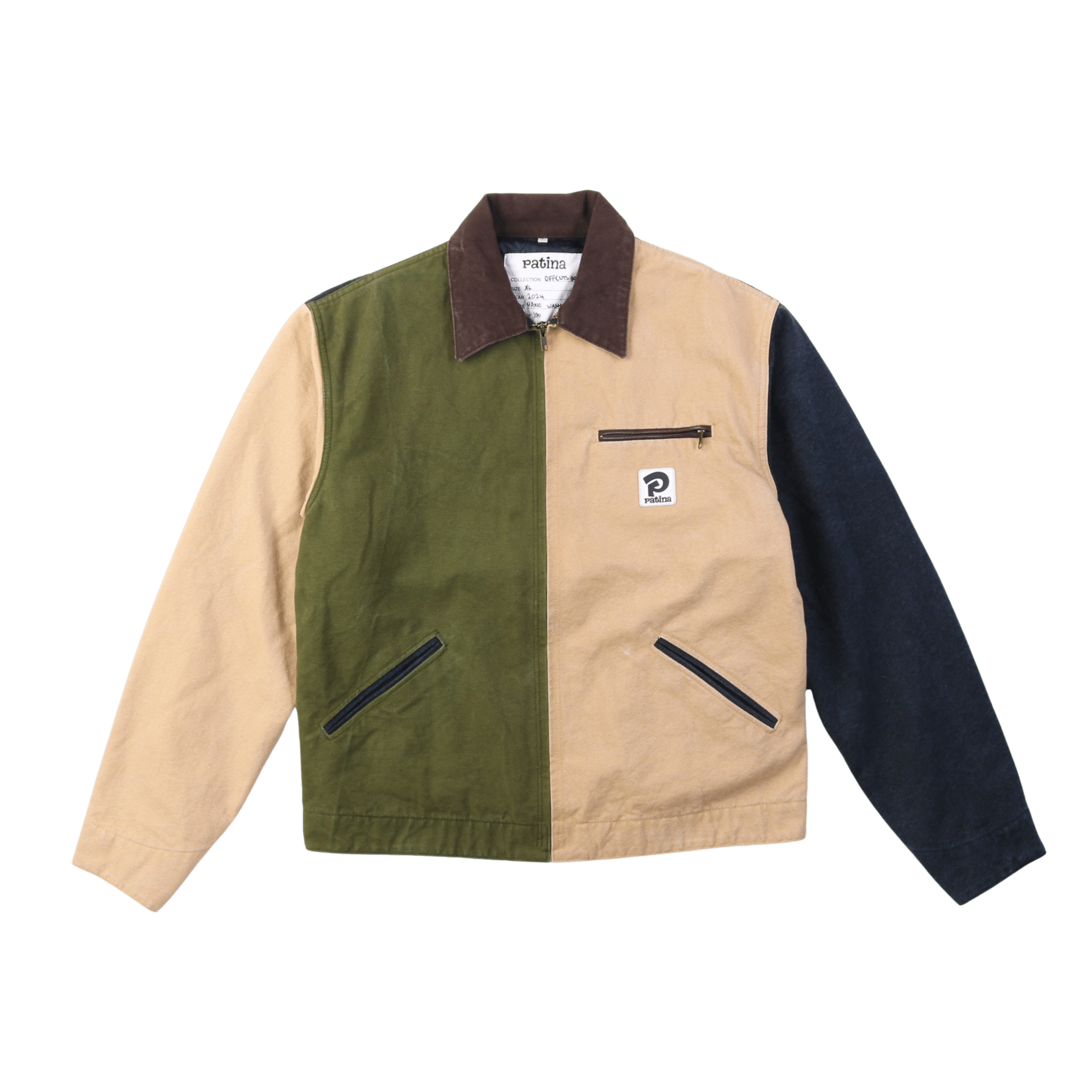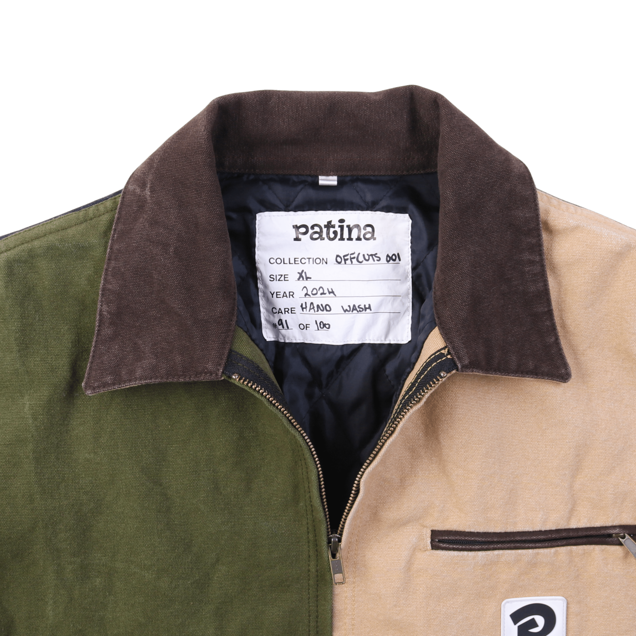 Elevate your wardrobe with a Patina Work Jacket, a fusion of classic workwear and environmentally conscious innovation. For Offcuts 001 we meticulously crafted recycled offcuts sourced from our very own production waste.